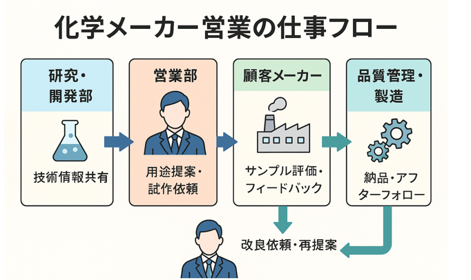 顧客の製品に「どんな化学素材を使えば品質が上がるか」を提案する、いわば“用途提案型営業”です。