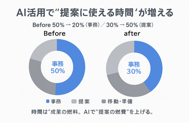 時間を奪われていた「事務作業」をAIに任せることで、提案の中身に集中できる時間が生まれる。