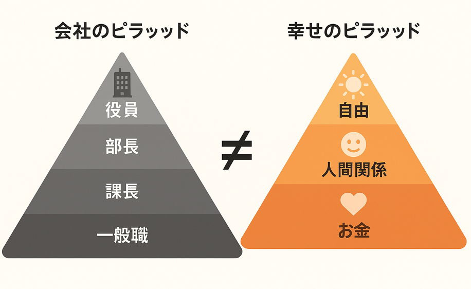 会社のピラミッドと、幸せのピラミッドの比較図