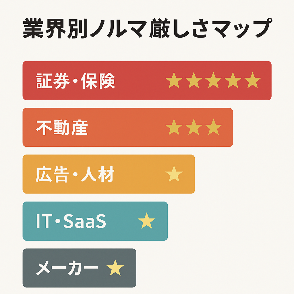 こうした統計を見ると、**「ノルマが厳しい=証券・保険・不動産」「比較的緩い=メーカー」**という構図が、主観だけでなく数字でも裏付けられていることがわかります。