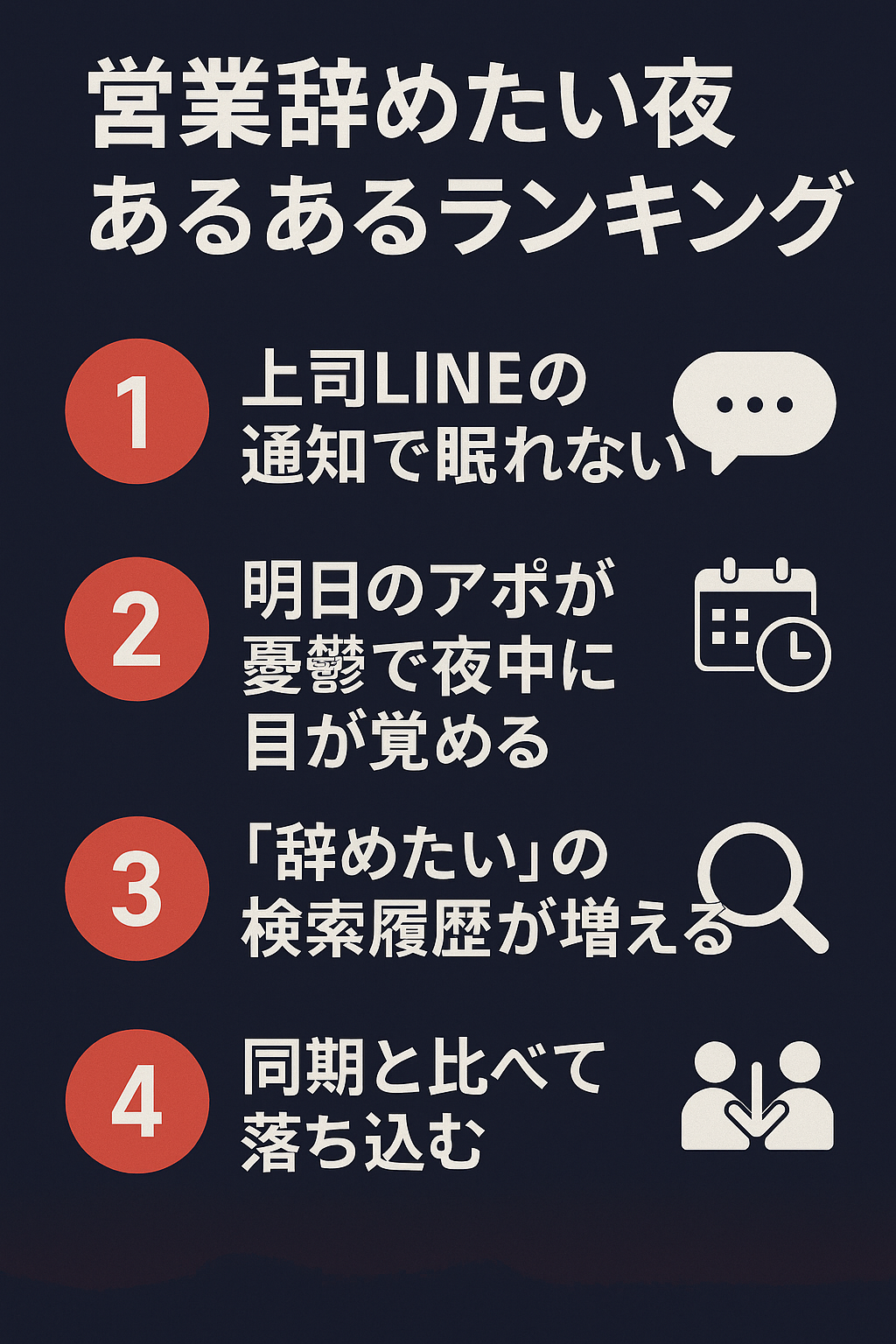 この記事では「営業辞めたい夜」に僕が考えたこと、同期のリアル、そして実際に辞めた人の声をまとめます。