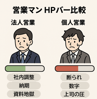 一方、個人営業は断られる・数字に追われる“直接的なダメージ”**が強烈。
